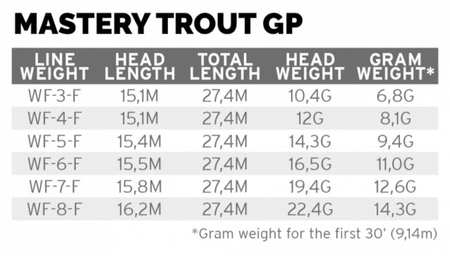Trout GP bruker den koniske belly'en fra Infinity, og har en litt lengre for- og baktapping og en ¼-størrelse tungvektslinje.