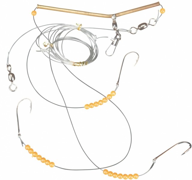 Takkel med dobbeltslep, glidebom og en opphenger. Laget for driftfiske fra båt, der to agn fiskes helt nede ved bunnen, mens det tredje svevet litt over. Krokstørrelse 1/O. Gjennomsiktige perler som attraktor.