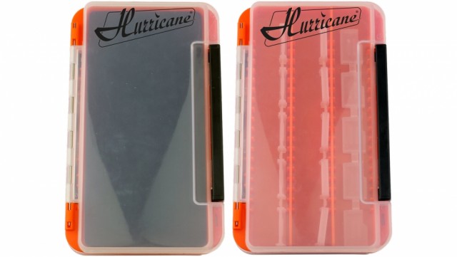 Hurricane dobbeltsidig oppbevaringsboks har slisset skum på den ene siden hvor du kan legge forskjellige krokutstyr og fluer, og inndelbare rom på den andre siden.