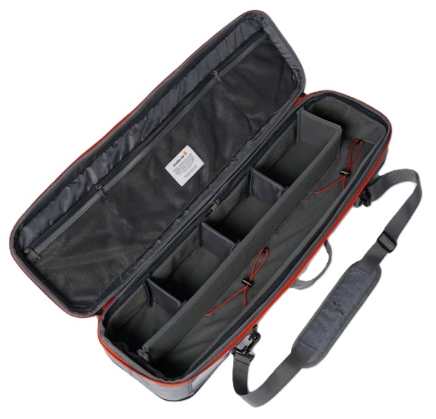 Bagen rommer opp til 6 stykk 4-delte enhåndsstenger i lengen 9’9" eller 4 stykk 6-delte tohåndsstenger opptil 14 fot. Da får du også god plass til sneller, fluebokser, flueliner og tilbehør. Innvendig er bagen kledd med mykt stoff og har justerbare skillevegger som holder stengene trygt adskilt fra sneller og øvrig utstyr. På innsiden av lokket finnes tre glidelåslommer i mesh i ulike størrelser for liner og tilbehør. Stangrommet har også to justerbare elastiske bånd som holder stengene sikkert på plass under transport.