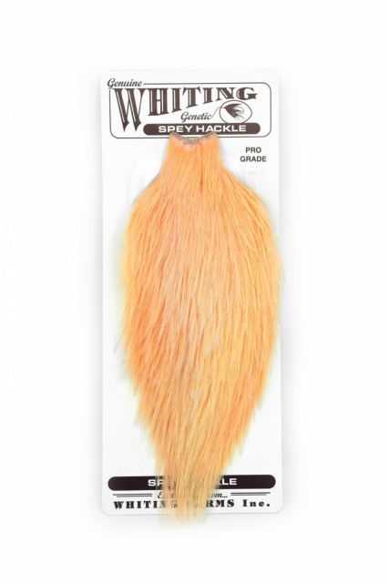 Instigating a number of genetic avenues, development proceeded towards a “genetic” Spey Hackle, which then became available after about 5 years of initial selection work. Feather characteristics sought included long, substantial barbs, absence of any webbing between the barbs, non brittleness of the entire feather and excellent density for good value. In addition to a pure white, which is deal for dying, an array of other color and pattern genes were incorporated into this “genetic” Spey hackle stock. Thus new and unusual feather colors and patterns would be available to encourage the inherent creativity of fly tiers. A wide range of feather sizes will also be available from these “genetic” Spey hackle chicken, thus allowing an even wider range of fly sizes to be tied.
