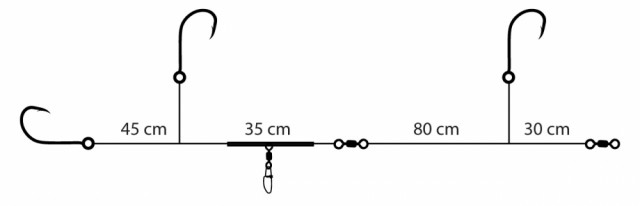 Takkel med dobbeltslep, glidebom og en opphenger. Laget for driftfiske fra båt, der to agn fiskes helt nede ved bunnen, mens det tredje svevet litt over. Krokstørrelse 1/O. Gjennomsiktige perler som attraktor.