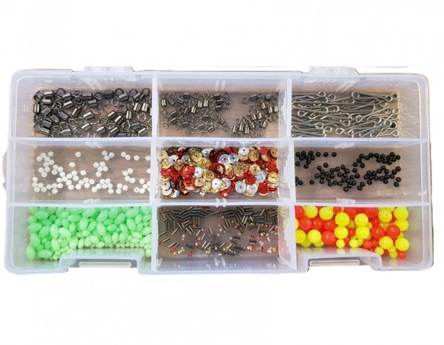 Inneholder bla. main line swivels, snood swivels, crimps, glow beads, fluor beads, leads clips, black beads, pearl beads, sequins.